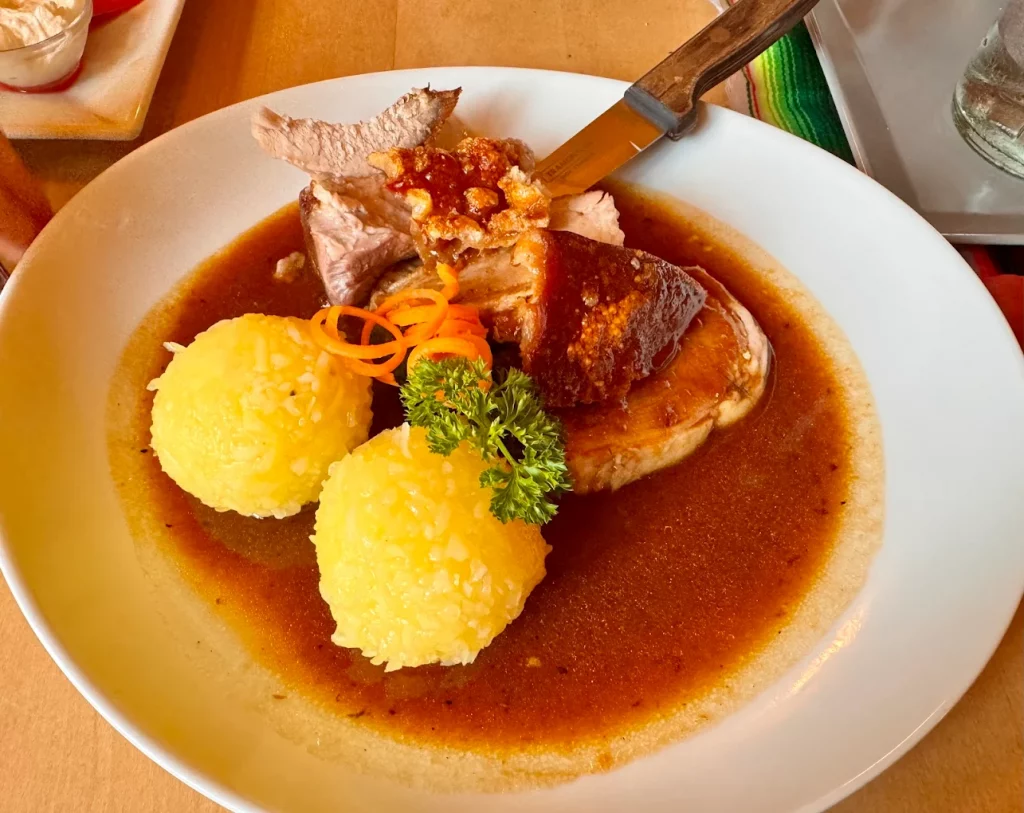 Jeden Sonntag gibt es unseren ofenfrischen Schweinebraten mit Knödel und Krautsalat